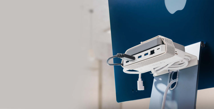 BackPack is a snap to install. Literally. A two-piece holster snaps into the oval opening on the back of your iMac stand. Then you slide the stand onto the holster. That’s it. So easy. By the way, the holster is clear so the color of your iMac shows through. Spruce up your iMac workspace. Order your BackPack today.